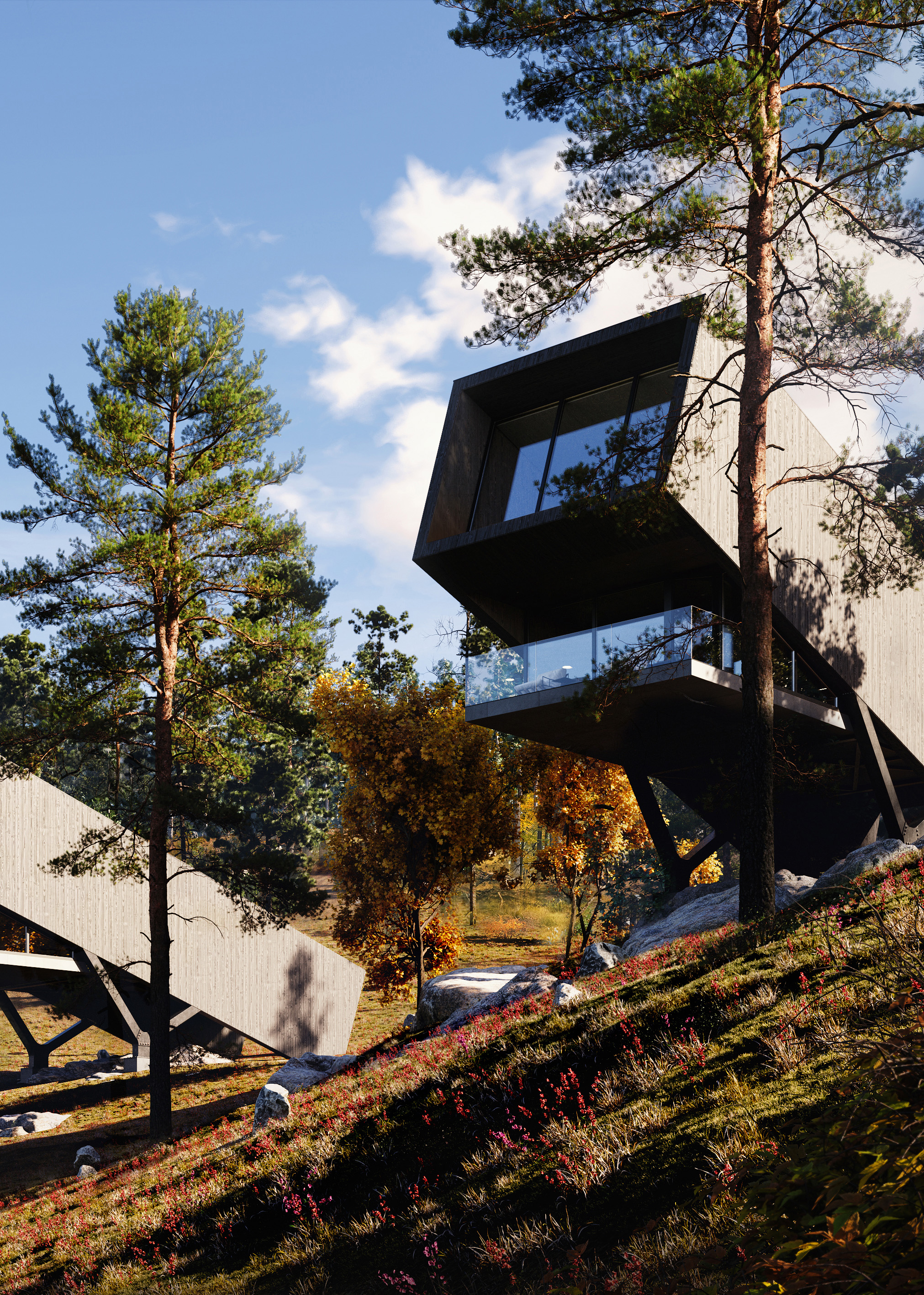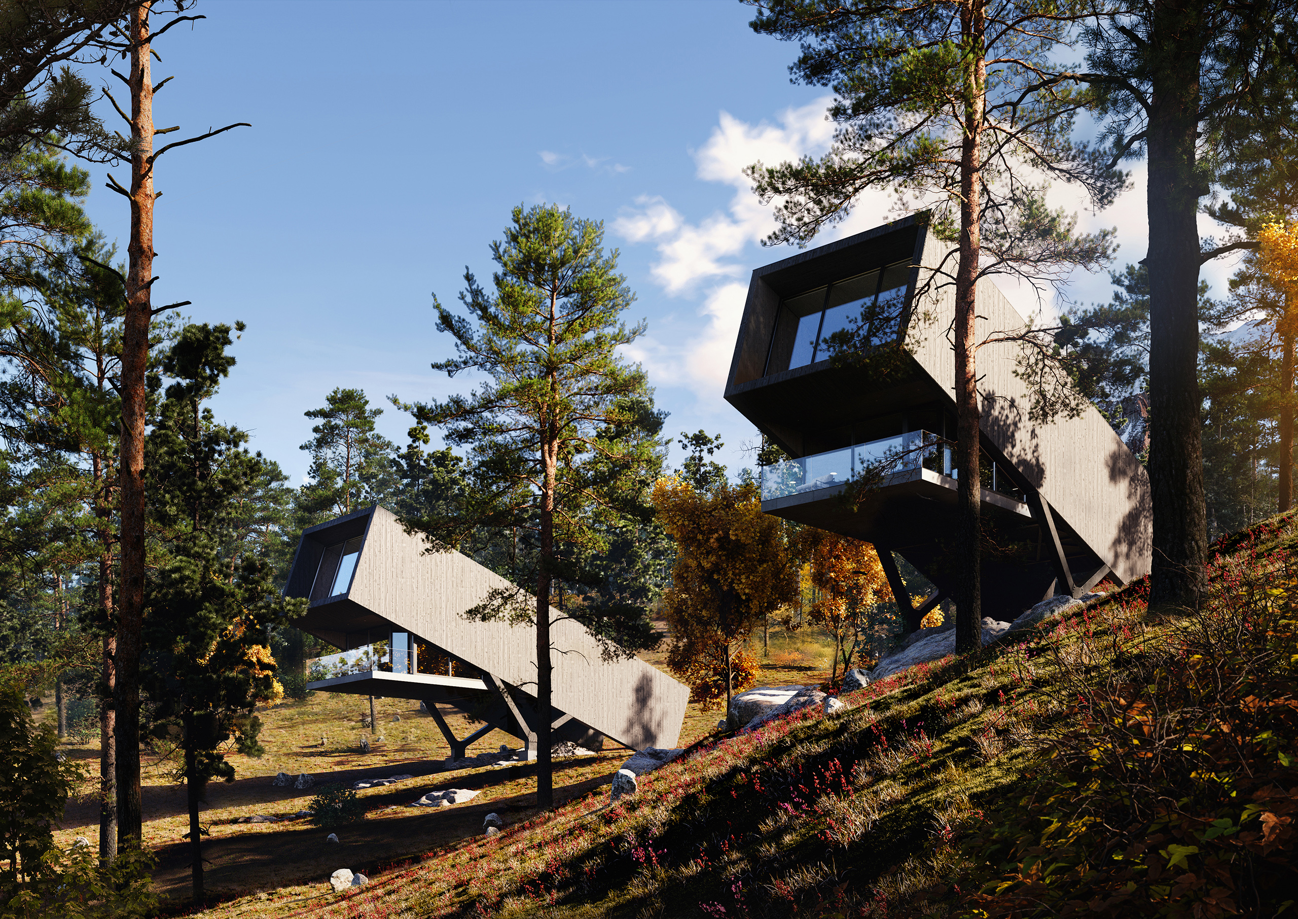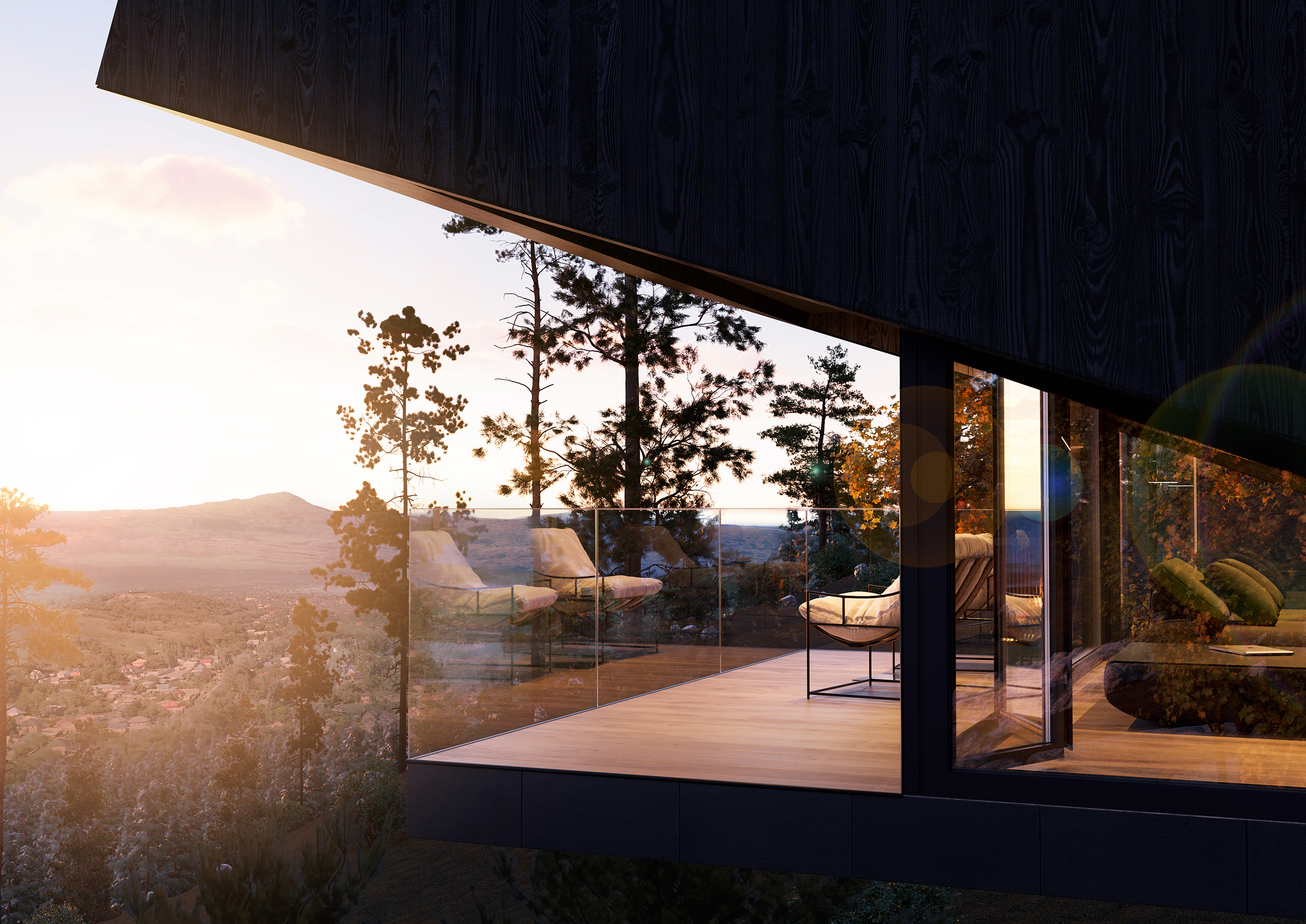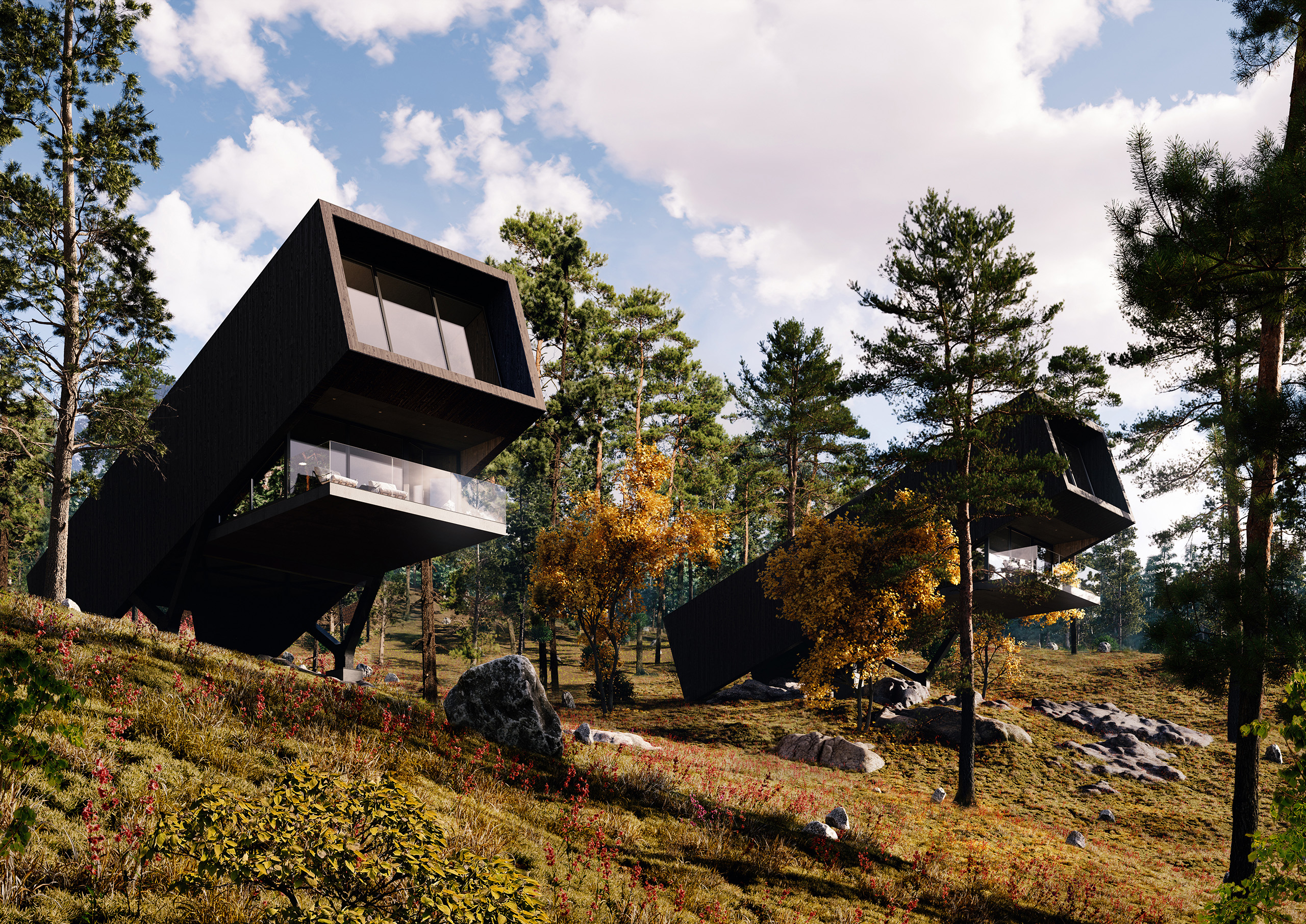 This modern modular cabin retreat in the Almaty region mountain woods is designed to have as little impact on the environment as possible by using only locally sourced materials. The two-story layout makes the most of the views and ensures guests are comfortable. The first floor includes the kitchen, dining, and living spaces, while the bedroom and bathroom are upstairs. The cabin stands out with its striking charred wood exterior, created using the traditional Japanese Shou Sugi Ban method. This not only makes the cabin durable but also helps it fit naturally and responsibly into the forest.